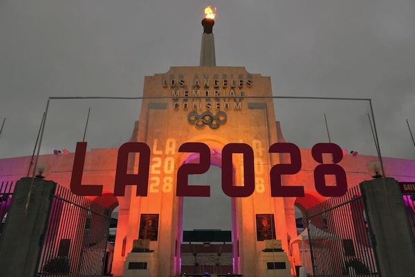 An LA 2028 sign is seen in front of the Olympic cauldron at the Los Angeles Memorial Coliseum, on Sept. 13, 2017.Richard Vogel/The Associated Press