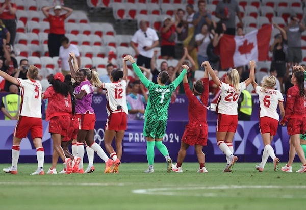 Canada women's soccer players celebrate after winning the Olympic group stage match against Colombia on July 31, 2024 at Nice Stadium.Raquel Cunha/Reuters