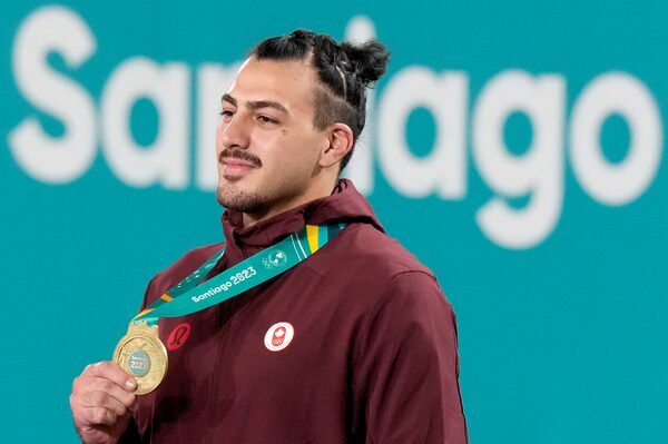 Canada's Shady ElNahas accepts his gold medal after winning the men's 100kg judo match against Chile's Thomas Briceno at the Pan American Games, in Santiago, Chile, on Oct. 30, 2023.Frank Gunn/The Canadian Press