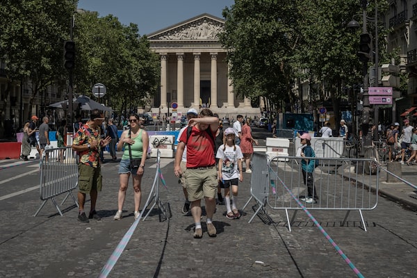 A man wipes sweat from his forehead as he walks with his family in the centre of Paris during the 2024 Olympic Games on July 30.Siegfried Modola/The Globe and Mail
