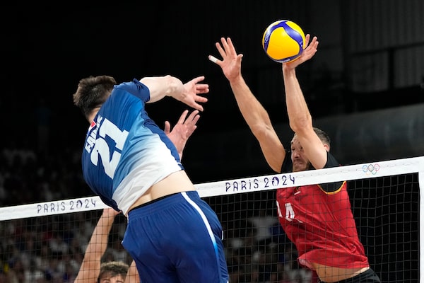 Theo Faure of France, left, spikes a ball as Moritz Karlitzek of Germany blocks, during a men's quarter final volleyball match between France and Germany at the 2024 Summer Olympics, Monday, Aug. 5, 2024, in Paris, France.Dolores Ochoa/The Associated Press