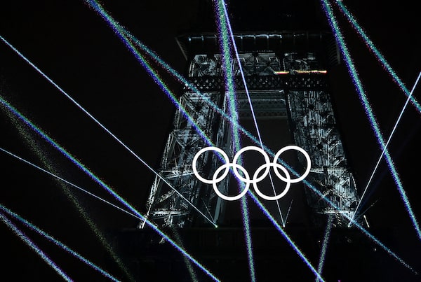 The Olympic rings are pictured on the Eiffel Tower as lasers shine during the opening ceremony on July 26 in Paris.Dylan Martinez/Reuters