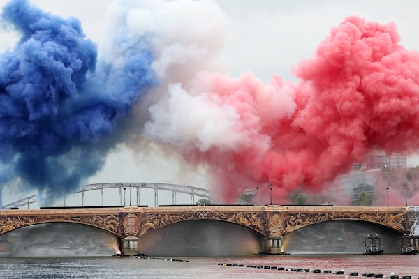 Smoke in the colours of the French flag billows from Austerlitz Bridge during the opening ceremony of the Paris Olympic Games.Kevin C. Cox/Getty Images