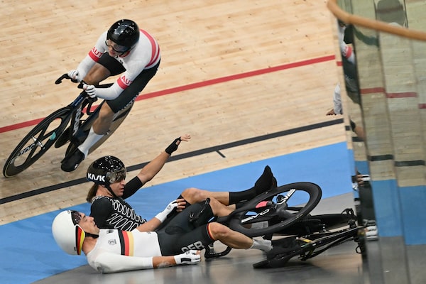 Germany's Theo Reinhardt and New Zealand's Aaron Murray Gate suffer a crash in the men's track cycling madison final of the Paris 2024 Olympic Games at the Saint-Quentin-en-Yvelines National Velodrome in Montigny-le-Bretonneux, south-west of Paris, on August 10, 2024.SEBASTIEN BOZON/Getty Images