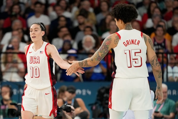 United States' Breanna Stewart (10) and Brittney Griner (15) play against Australia during a women's semi-final basketball game at Bercy Arena at the 2024 Summer Olympics on Aug. 9.Michael Conroy/The Associated Press