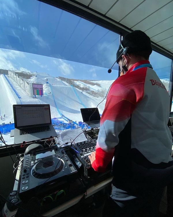 Up at Zhangjiakou, the mountain resort 150 kilometres from Beijing where most of the ski and snowboard events are being held, Aaron Markham, stage name DJ Trizz, is working the half-pipe.