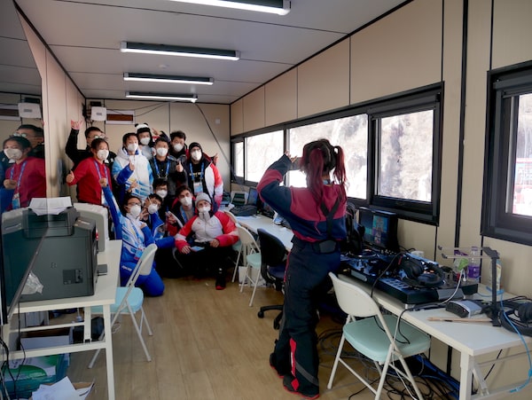 Nakagawa poses for a photo with colleagues inside their studio overlooking the Yanqing National Alpine Ski Centre.James Griffiths/The Globe and Mail