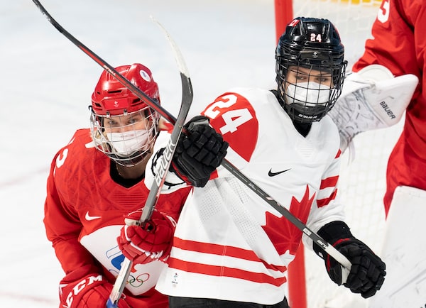 Canada forward Natalie Spooner, right, and Russian Olympic Committee defender Maria Pechnikova during a game at the Beijing Olympics, on Feb. 7.Ryan Remiorz/The Canadian Press