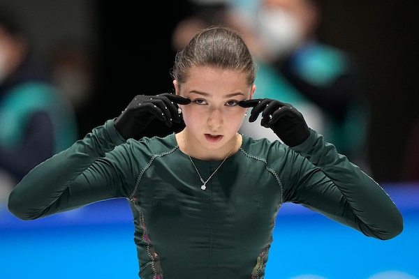 Kamila Valieva, of the Russian Olympic Committee, wipes her eyes during a training session at the 2022 Beijing Olympics, on Feb. 13.David J. Phillip/The Associated Press