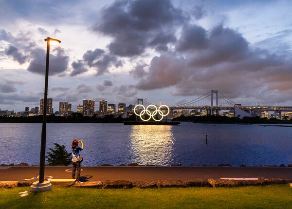 Just outside Shiokaze Park, the beach volleyball venue, is a view of the Olympic rings and the Rainbow Bridge in Tokyo Bay. This is one of very few Olympic-themed decorations that dot Tokyo. The COVID-19 restrictions blocked the public from areas inside and around the Olympic venues. July 29.