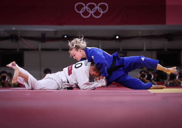 Jessica Klimkait was a favourite for gold in women’s judo under-57-kilogram class, but she was penalized in the semi-final bout against Sarah-Léonie Cysique of France. That led to a bronze-medal match against Kaja Kajzer of Slovenia, in which Ms. Klimkait won the bronze less than an hour after her penalty. July 26.