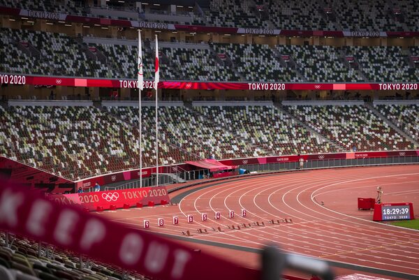 Tokyo Olympic Stadium was empty during the Olympics. Because of pandemic restrictions, spectators were banned. Organizers set up the starting blocks a half hour ahead of the first heats in the 100-metre event. July 31.