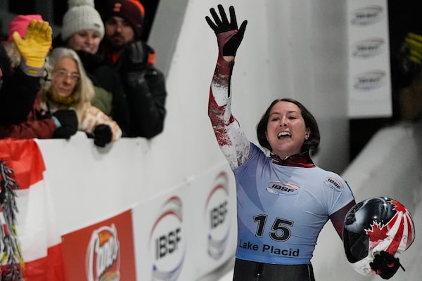 Canada's Jane Channell waves to fans at the skeleton world championships in March, 2025, in Lake Placid, N.Y.Julia Demaree Nikhinson/The Associated Press