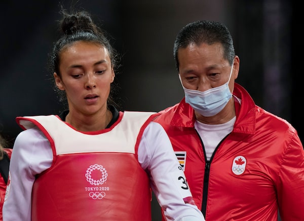 Skylar Park, from Winnipeg, Man., walks with her coach and father Jae Park after losing to Taiwan’s Chia-Ling Lo in the Women’s 57Kg Taekwondo quarter-final at the Tokyo Olympics.The Canadian Press