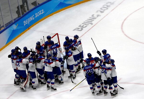 Patrik Rybar of Slovakia celebrates with teammates beating the U.S. 3-2 in a shootout on Feb. 16, 2022.CARLOS PEREZ GALLARDO/Reuters