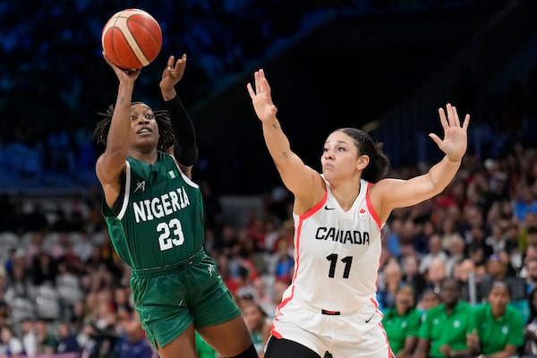 Nigeria's Ezinne Kalu shoots over Canada's Natalie Achonwa during a game at the Paris Olympics, on Aug. 4.Mark J. Terrill/The Associated Press