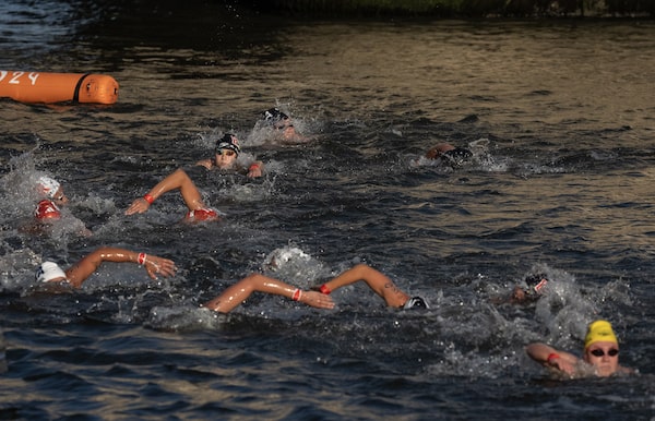Swimmers compete in the river Seine at the start of the women’s 10km marathon swimming event during the 2024 Olympic Games, on Aug. 8 in the Seine.Siegfried Modola/The Globe and Mail