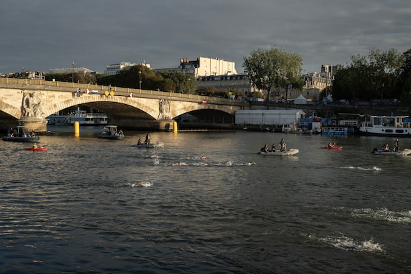 Swimmers compete in the river Seine at the start of the women’s 10km marathon swimming event during the 2024 Olympic Games.Siegfried Modola/The Globe and Mail