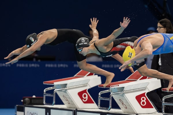 Canadian swimmer Maggie Mac Neil (centre) competes in the women’s 4x100 freestyle relay final on Saturday, July 27, 2024, in Paris, France, during the Olympic Games. Siegfried Modola/The Globe and MailSiegfried Modola/The Globe and Mail