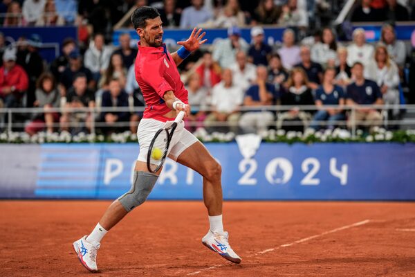 Serbian tennis player Novak Djokovic returns the ball against Matthew Ebden of Australia during the men's singles tennis competition, at the 2024 Summer Olympics, Saturday, July 27, 2024, in Paris, France.Manu Fernandez/The Associated Press