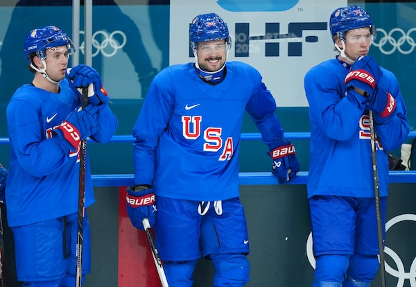 Auston Matthews cracks a smile during practice with his United States teammates in Milan. They open play on Thursday against Latvia.Nathan Denette/The Canadian Press