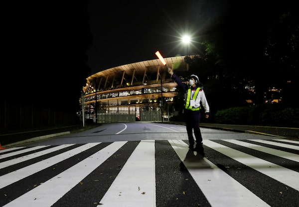 A security guard stands in front of the National Stadium, the main venue of the Tokyo Olympics and Paralympics, on July 12.KIM KYUNG-HOON/Reuters