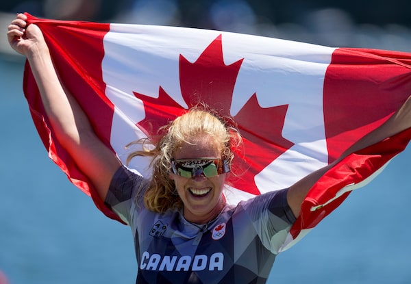 Laurence Vincent-Lapointe, of Canada, celebrates her silver medal finish in the women's canoe single 200-metre final at the Tokyo Summer Olympics.Lee Jin-man/The Associated Press