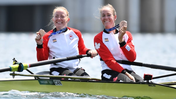 Bronze medallists Caileigh Filmer of Victoria, B.C. and Hillary Janssens of Surrey, B.C. celebrate with their medals in their boat at the Tokyo Olympics.PIROSCHKA VAN DE WOUW/Reuters