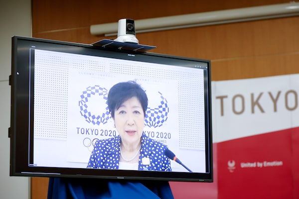 Tokyo Governor Yuriko Koike speaks remotely during a four-party meeting in Tokyo, on Aug. 16.POOL/Reuters
