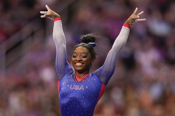 Simone Biles celebrates her performance at the women’s U.S. Olympic gymnastics trials in St. Louis this past June.Jeff Roberson/The Associated Press