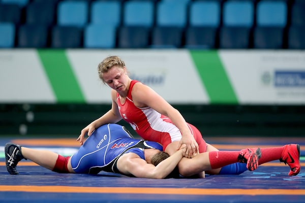 Erica Wiebe, top, wrestles Adeline Gray of the United States at a 2016 Olympic test event.Matthew Stockman/Getty Images