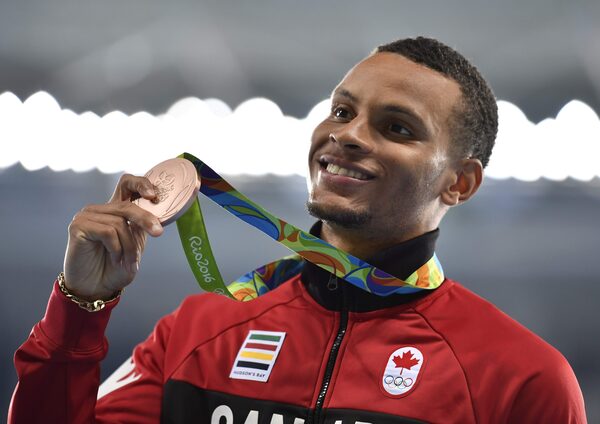 Andre De Grasse holds his bronze medal from the men's 100-metre event at the 2016 Olympics in Rio de Janeiro.FABRICE COFFRINI/AFP/Getty Images