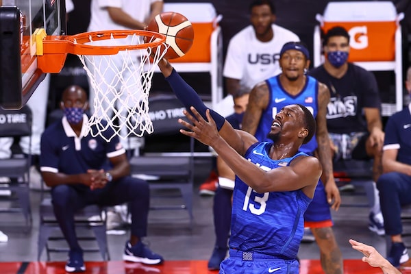 Bam Adebayo of Team USA lays up the ball at a July 13 exhibition game against Argentina in Las Vegas.Chase Stevens/Las Vegas Review-Journal via AP