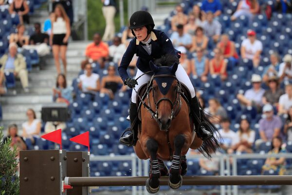 Jessica Springsteen, riding RMF Zecile, clears a hurdle at a 2018 jumping competition in Paris.Gonzalo Fuentes/Reuters