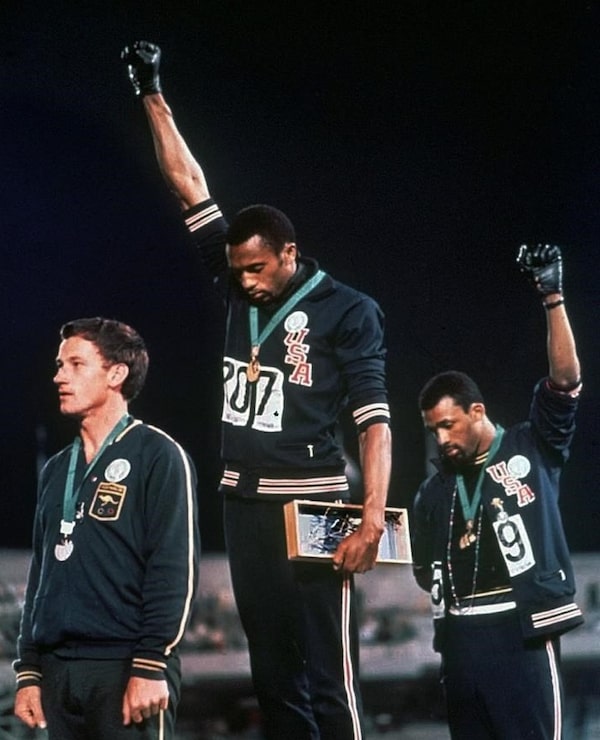 U.S. Olympians Tommie Smith, middle, and John Carlos, right, raise their fists during a playing of the American national anthem at the 1968 Olympics in Mexico City.The Associated Press