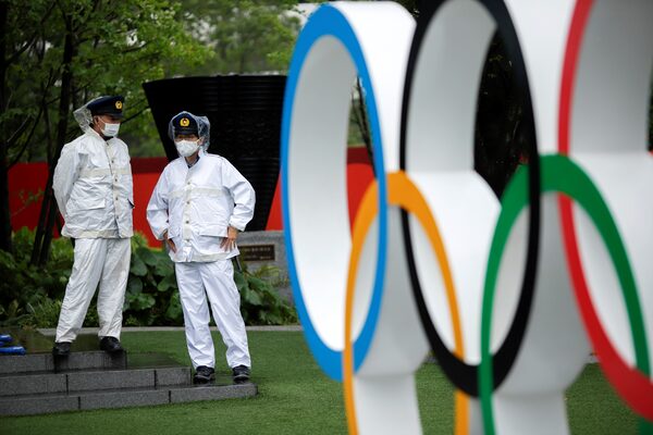 Policemen stand near the Olympic Rings outside the Olympic stadium in a calmer moment of tropical storm Nepartak in Tokyo, Japan on July 27, 2021.ANDRONIKI CHRISTODOULOU/Reuters