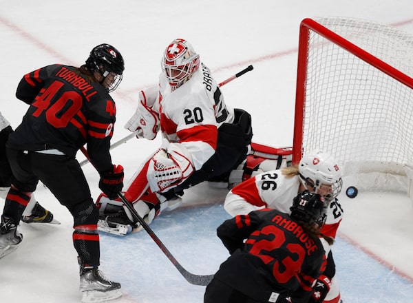 Blayre Turnbull of Canada scores a goal against the Swiss as Canada posts a 12-1 win.DAVID W CERNY/Reuters