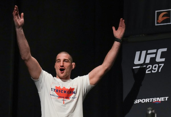 Middleweight champion Sean (Tarzan) Strickland, perhaps the loosest of loose cannons in the UFC’s arsenal, walked onto the stage at the Winter Garden Theatre wearing a white T-shirt with Strickland emblazoned over a red Maple Leaf above the words “Make Canada Great Again,” a take on Donald Trump’s “Make America Great Again” slogan.