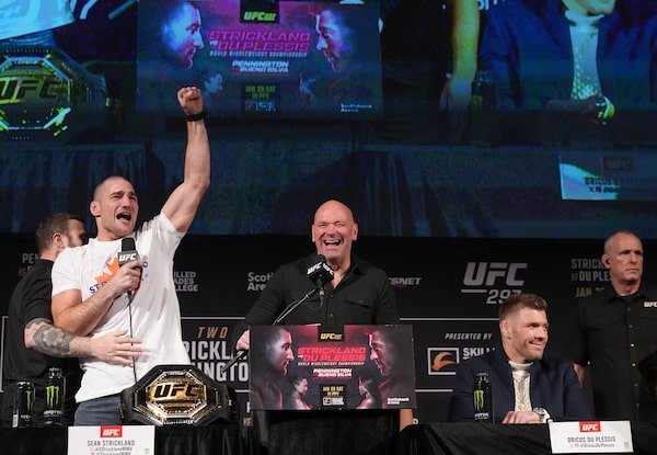 UFC middleweight champion Sean Strickland, left, and Dricus Du Plessis, right, hold a news conference ahead of UFC 297, in Toronto, on Jan. 18.Nathan Denette/The Canadian Press