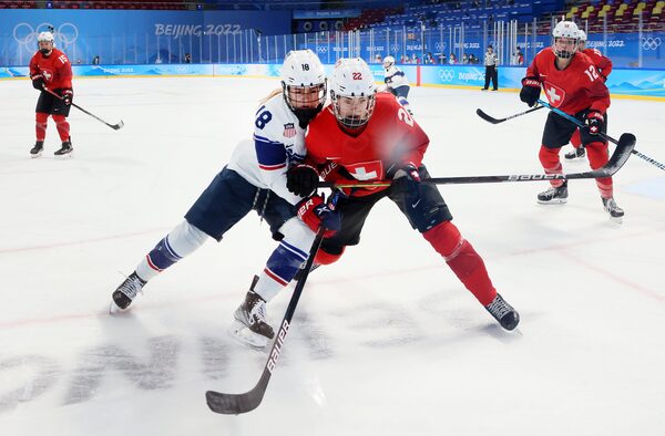 U.S. forward Jesse Compher collides with Swiss defender Sinja Leemann during the women's preliminary round Group A match on Feb. 6, 2022 in Beijing.Bruce Bennett/Getty Images