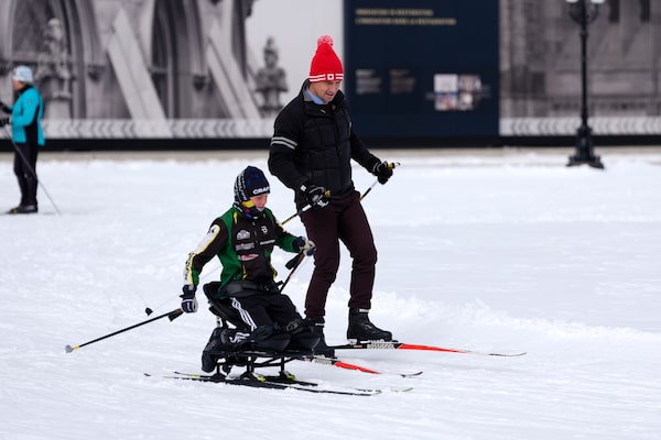 Van Koeverden, seen here skiing with 11-year-old Ronan Lebel, a sit-skier with the Nakkertok Cross Country Ski Club, at Parliament Hill last month, says he wants the federal government to continue to make sport accessible and to increase support at the grassroots level.Justin Tang/The Canadian Press