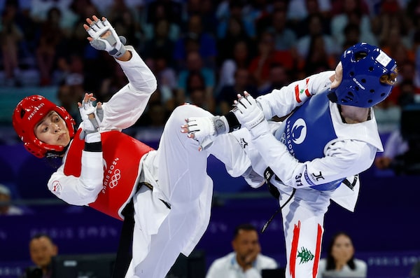 Skylar Park of Canada fight Laetitia Aoun of Lebanon in their bronze-medal match in women’s taekwondo at the Paris Olympics on Aug. 8.Albert Gea/Reuters
