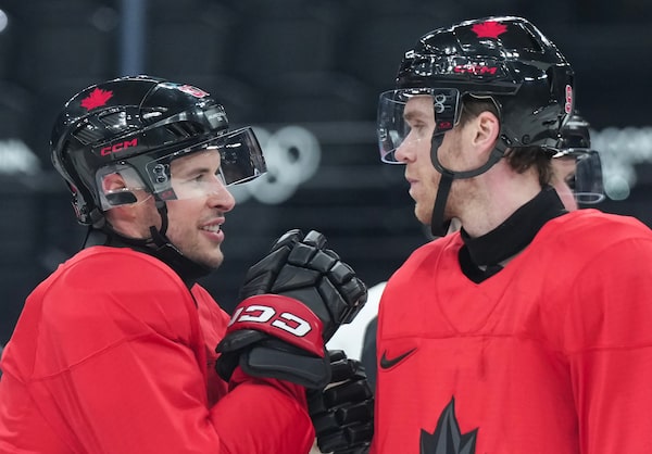 Captain Sidney Crosby, left, talks with teammate Connor McDavid during practice. McDavid watched Crosby's golden goal when he was just 13.Nathan Denette/The Canadian Press