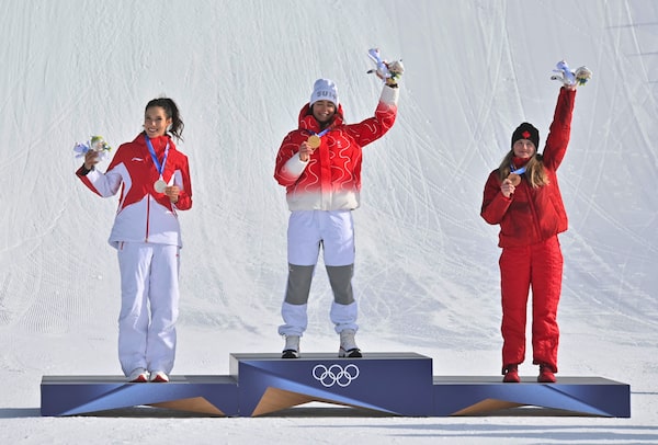 From left, silver medalist China's Eileen Gu, gold medalist Switzerland's Mathilde Gremaud and bronze medalist Canada's Megan Oldham stand on the podium after the women's freestyle skiing slopestyle finals.Fabrizio Troccoli/The Globe and Mail