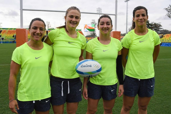 Members of Brazil's women's Olympic rugby team (from L) Isadora Cerullo, Raquel Kochhann, Tais Balconi and Juliana Santos pose at Deodoro Stadium in Rio de Janeiro on August 4, 2016, ahead of the Rio 2016 Olympic Games.PASCAL GUYOT/AFP / Getty Images