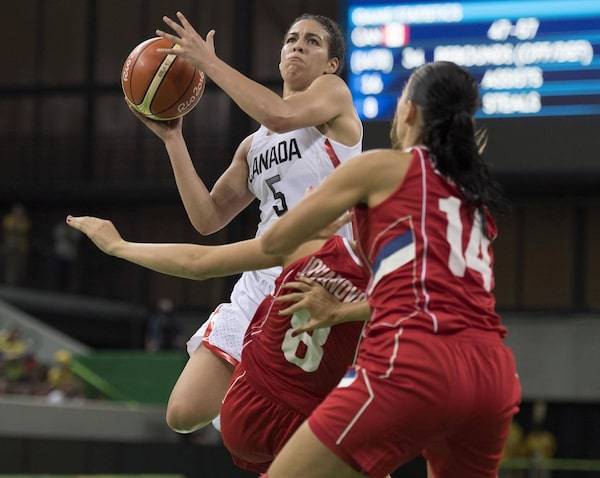 Canada's Kia Nurse drives through Serbia's Nevena Jovanovic and Ana Dabovic on her way to the hoop during their preliminary round basketball match at the 2016 Summer Olympics on August 8, 2016 in Rio de Janeiro, Brazil.Frank Gunn/The Canadian Press