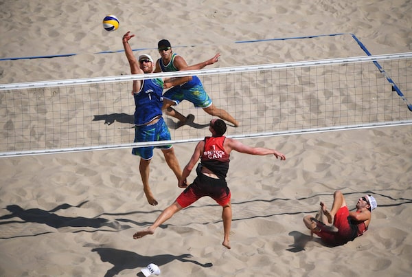 Binstock and Schachter were visibly elated as they fought back from a four-point deficit and tied the second set at 17, 18 and 19, then went up 20-19. Brazil tied it up again. Then it appeared that Binstock had put Canada ahead 21-20. The play was disputed, and the crowd shrieked while Binstock conferred with the referee. The replay showed the Canadian hit the net on his follow-through, which gave Brazil the point. After that, the Brazilians moved in swiftly to take the match on an error to Schachter, and the finally-full stadium heaved with a sense of righteous jubilation.