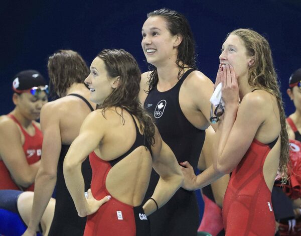 The Canadian team reacts after finishing third in the women’s 4 x 100 freestyle relay.DOMINIC EBENBICHLER/Reuters