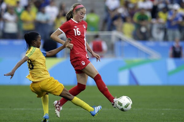 Canada's Janine Beckie controls the ball past Zimbabwe's Rejoice Kapfumvuti during a group B match of the women's Olympic football tournament between Canada and Zimbabwe in Sao Paulo, Brazil, Saturday, Aug. 6, 2016.Nelson Antoine/The Associated Press