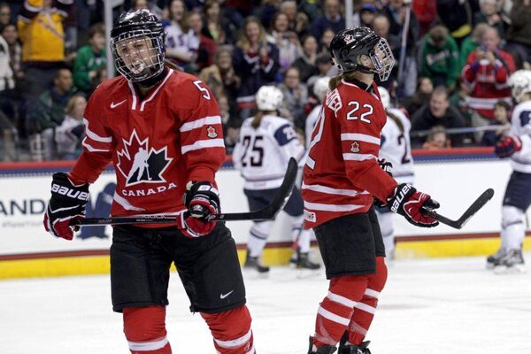 Canada defenceman Lauriane Rougeau (5) and forward Hayley Wickenheiser (22) react after allowing a goal during the first period against USA in an exhibition hockey game at Xcel Energy Center.Brace Hemmelgarn